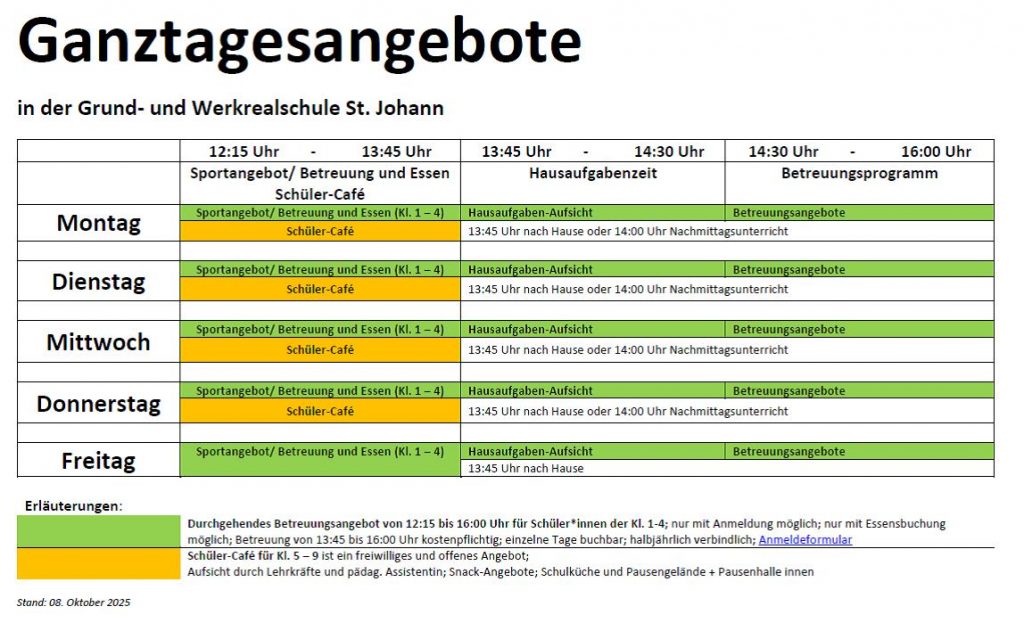 Die Grund- und Werkrealschule St. Johann bietet eine flexible und kostengünstige Ganztagesbetreuung mit Mittagessen für alle Klassenstufen an. Ein Team aus sehr kompetenten und erfahrenen Mitarbeiterinnen und Mitarbeitern sorgt dafür, dass die Kinder nicht nur gut betreut sind, sondern auch einen schönen Tag und Entwicklungsförderung erleben können.